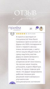 - работа с тревогой и паническими атаками. Если ваше тело подает сигналы в виде паники, учащенного сердцебиения или «кома в горле», мы научимся понимать эти сигналы и трансформировать страх в спокойную уверенность.